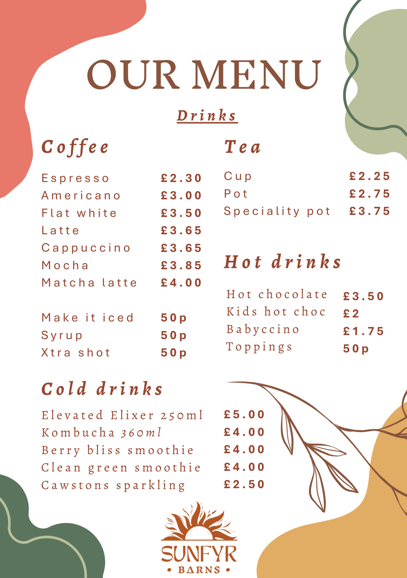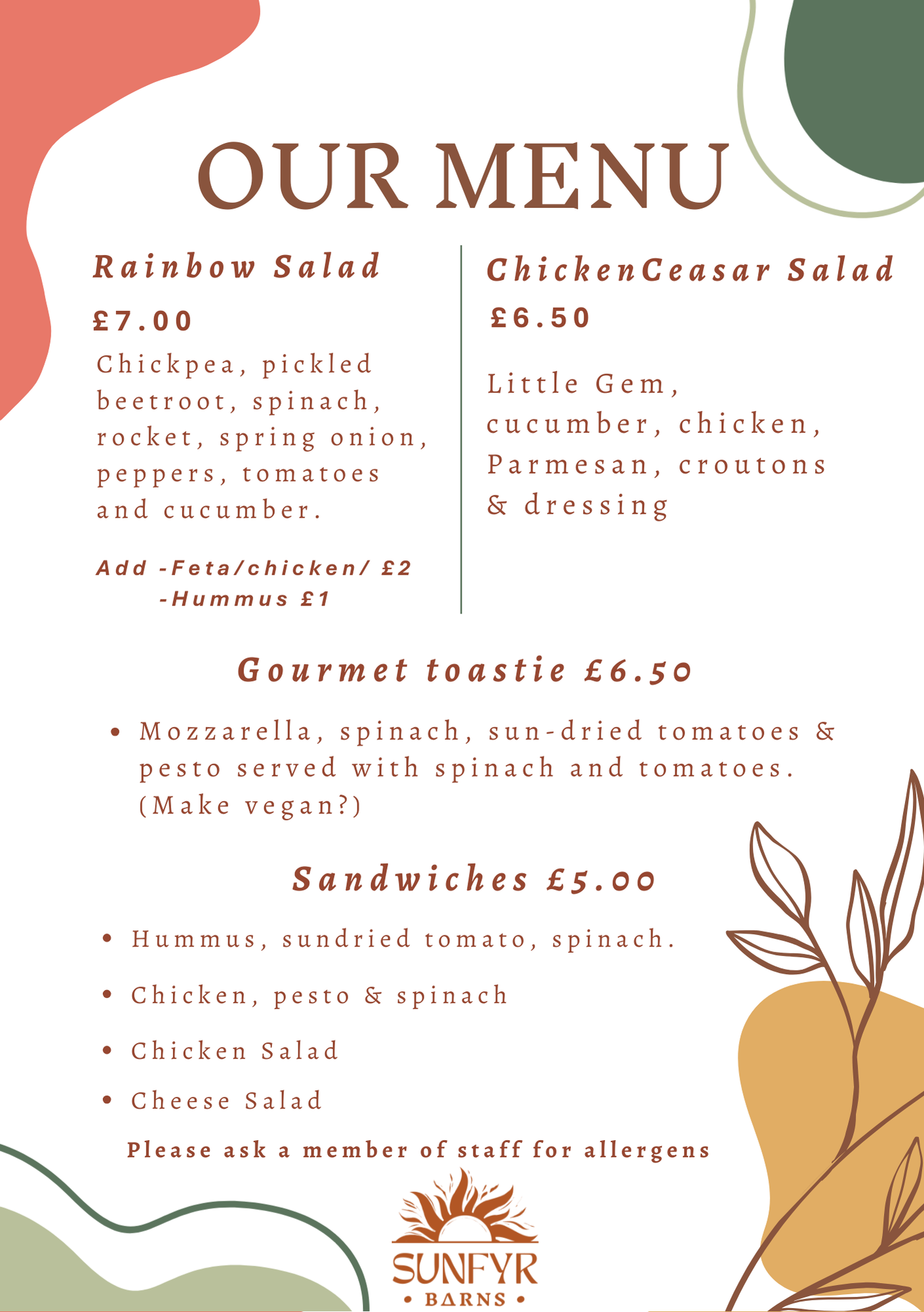 Sunfyr Barns have asked that people don’t bring their own food due to health and safety rules around allergies but please pre-order what you’d like via email and pay for your lunch on the day.